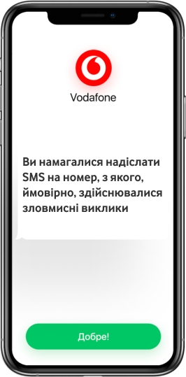 Якщо Ви намагаєтесь відправити SMS на номер, з якого ймовірно здійснювались зловмисні виклики чи надсилався спам, ми заблокуємо відправку SMS на цей номер та проінформуємо Вас про це у повідомленні з номеру “Vodafone”.